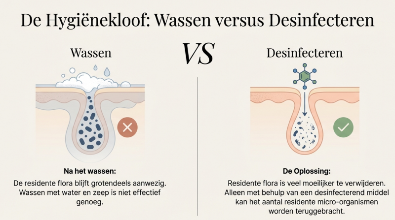 Hier wordt het voor een tattooshop pas écht belangrijk. Na het wassen van de handen met water en zeep blijft deze residente flora grotendeels gewoon aanwezig. Deze is namelijk veel moeilijker te verwijderen dan de transiënte flora. Omdat we bij het tatoeëren de huid doorbreken, is water en zeep niet genoeg. Alleen met behulp van een desinfecterend middel kan het aantal van deze residente micro-organismen worden teruggebracht. Dit is de reden waarom we jouw huid altijd zo grondig desinfecteren voordat de sessie begint!