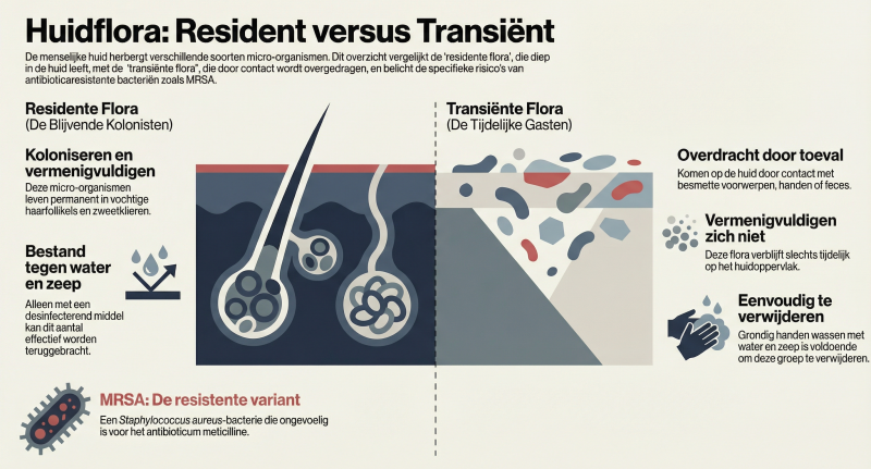 Transiënte flora | Bacteriën, gisten, schimmels, virussen, wratten etc. | Vermenigvuldigen zich niet op de huid; tijdelijk aanwezig. | Door toeval, handcontact, contact met besmette voorwerpen of feces. | Gemakkelijk te verwijderen door de handen te wassen met water en zeep. | Huid (handen). | [1] |