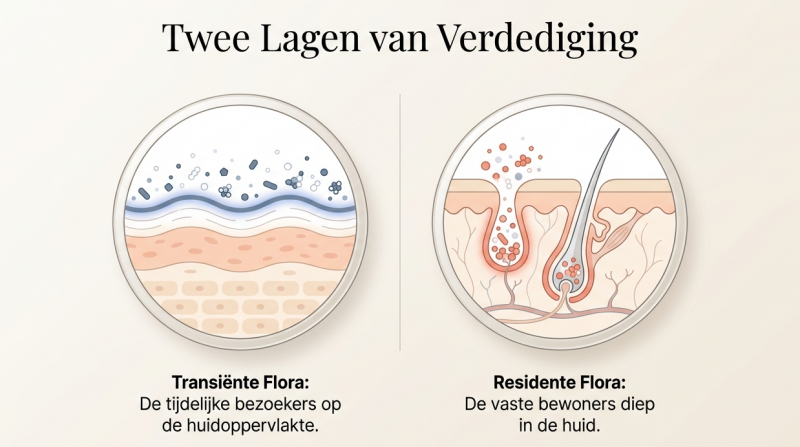 Naast de toevallige voorbijgangers heeft je huid ook vaste bewoners. Dit is de residente flora: micro-organismen die de huid koloniseren en zich daar wél vermenigvuldigen. Ze zoeken graag de vochtige plekjes op, waardoor de meeste huidbacteriën in de haarfollikels en zweetklieren leven. De residente flora bestaat voornamelijk uit de bacteriën Propionibacterium acnes en de Staphylococcus epidermidis.